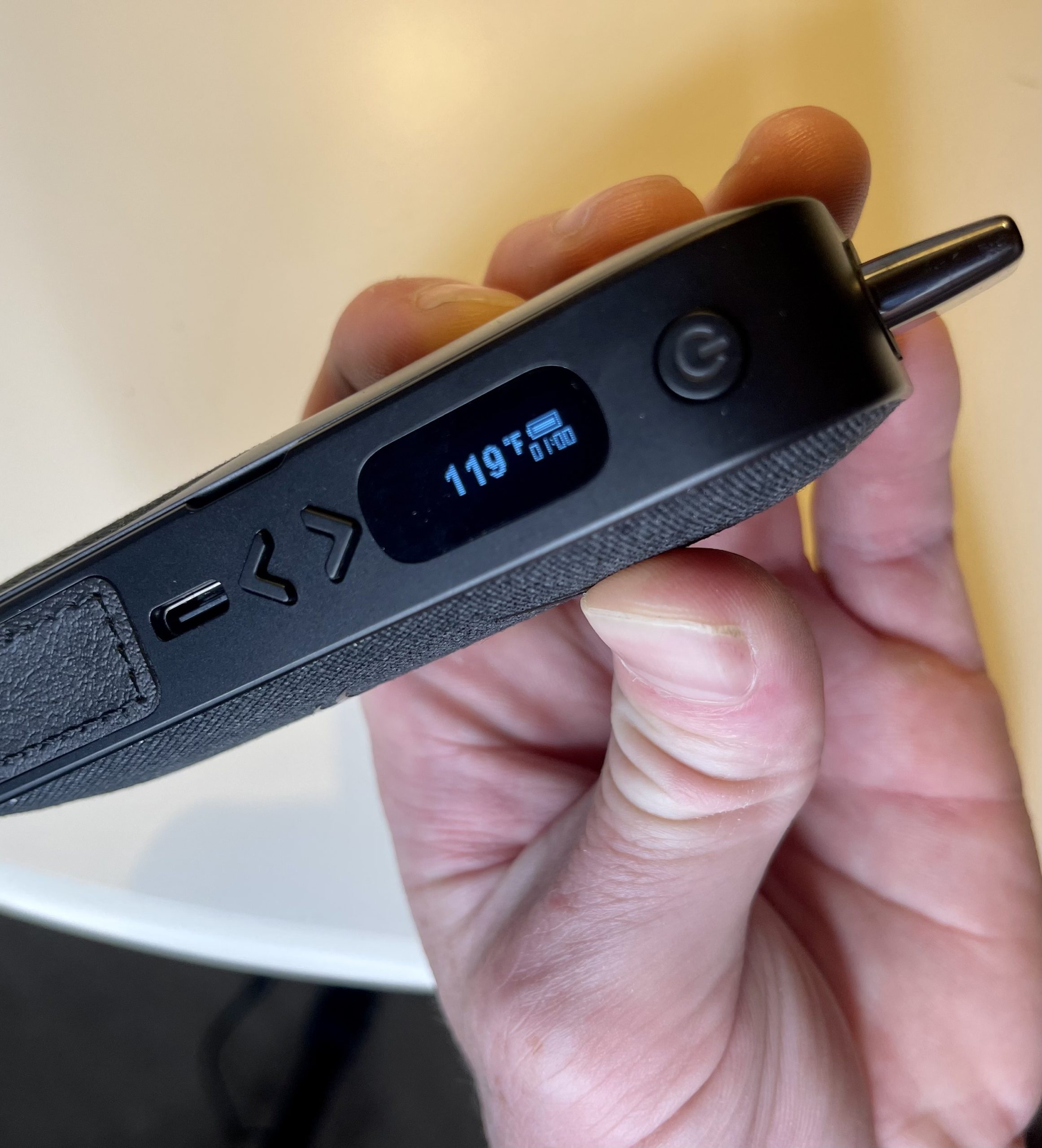 Gold Coated Herb Chamber – The herb chamber on the Pro is a tad more shiny than on the OG with much smaller holes on the bottom of the chamber from the previous version. The chamber capacity is about .25 comfortably but can do .3 if you don’t mind a tad more draw resistance. Removable Glass Vapor Path & Ceramic Mouthpiece – The Legacy Pro uses the exact same removable glass vapor path and ceramic mouthpiece as the previous Legacy model and yes they are interchangeable. While these are great components for flavor, you must exercise caution when cleaning as they are prone to be misplaced or break. The amount of internal moving parts which can be removed during cleaning is an overall negative of the AirVape Legacy Pro. Do not let this scare you away though, as when assembled this thing is as secure as it gets. Removable Battery – The AirVape LegacyPro uses a removable 3200 mAh 18650 battery. This not only offers a fast heat up time and multiple sessions on a single charge but gives the user the convenience of swapping out the battery with a spare to avoid any down time. Removable batteries have by in large been seen as a plus by the vaporizer community and if you have multiple vaporizers like the Arizer Argo, Davinci IQ2, AirVape Legacy Pro -which offer this feature you can swap batteries between all your vaporizers Micro Dosing Disk – Another added improvement is nixing the micro dosing basket and building in a swivel down component which can decrease the bowl size for micro-dosing, much like the chamber pearl functions on the Davinci IQ2. In theory the micro dosing disc is fantastic but it does not really cut the bowl size down to a true micro dosing capacity. It should be called a chamber reducer like the PAX half pack oven lid. Hemp & Leather Exterior – The AirVape Legacy Pro boasts a sleek black hemp & leather exterior making it fit in more with a finely decorated living room than say other consumer electronics. When I reviewed the original Legacy which has a similar pattern I stated it looks like a vaporizer for a grown up. Something that is rather elegant and stylish, but would likely become stained and tattered over time if proper care was not asserted. Digital Readout & Controls – On the left side of the device sits a digital readout screen, power button, temperature control buttons and the USB-C charging port.
