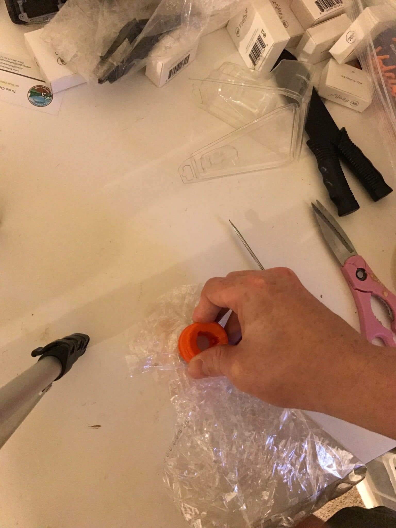 Rolling out the entire ten feet of solid valve bag material place the black O-ring over the end of the bag and and fasten against the clear plastic ring. You want to ensure the larger part of the plastic ring is facing upwards towards the top of the bag when it is filled.
