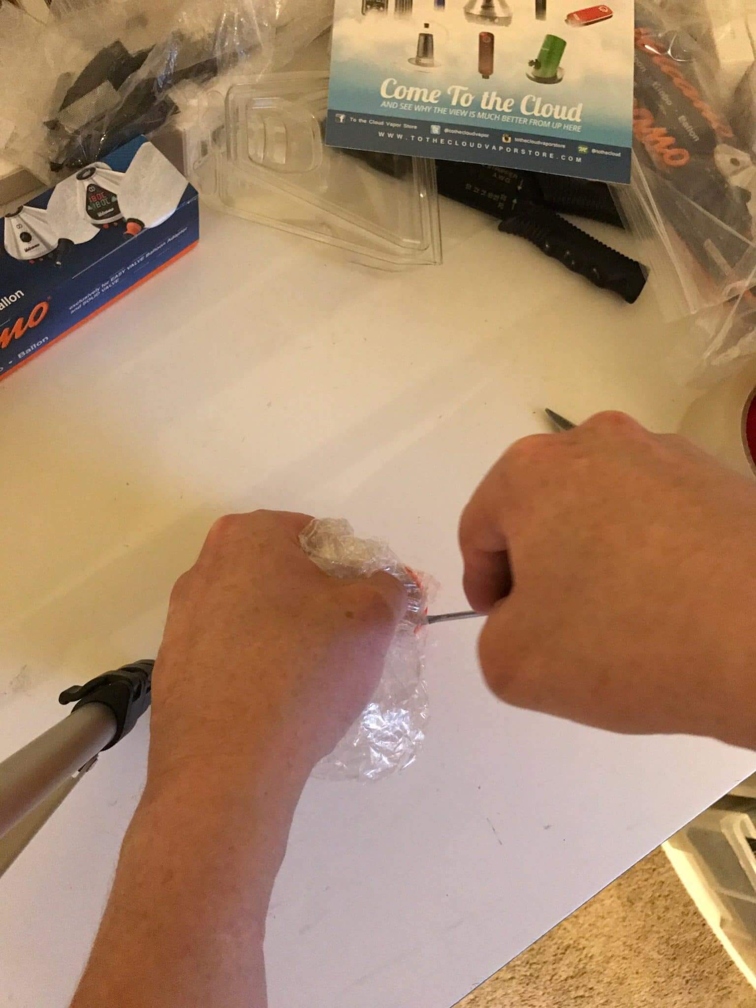 Take your orange piece and push it down on your stopper and plastic piece until you hear a click. From there insert your mouthpiece and dress up the bag a bit with some scissors and voila. You now have your very own 10’ Volcano Vaporizer party bag ready to go for your next big event.