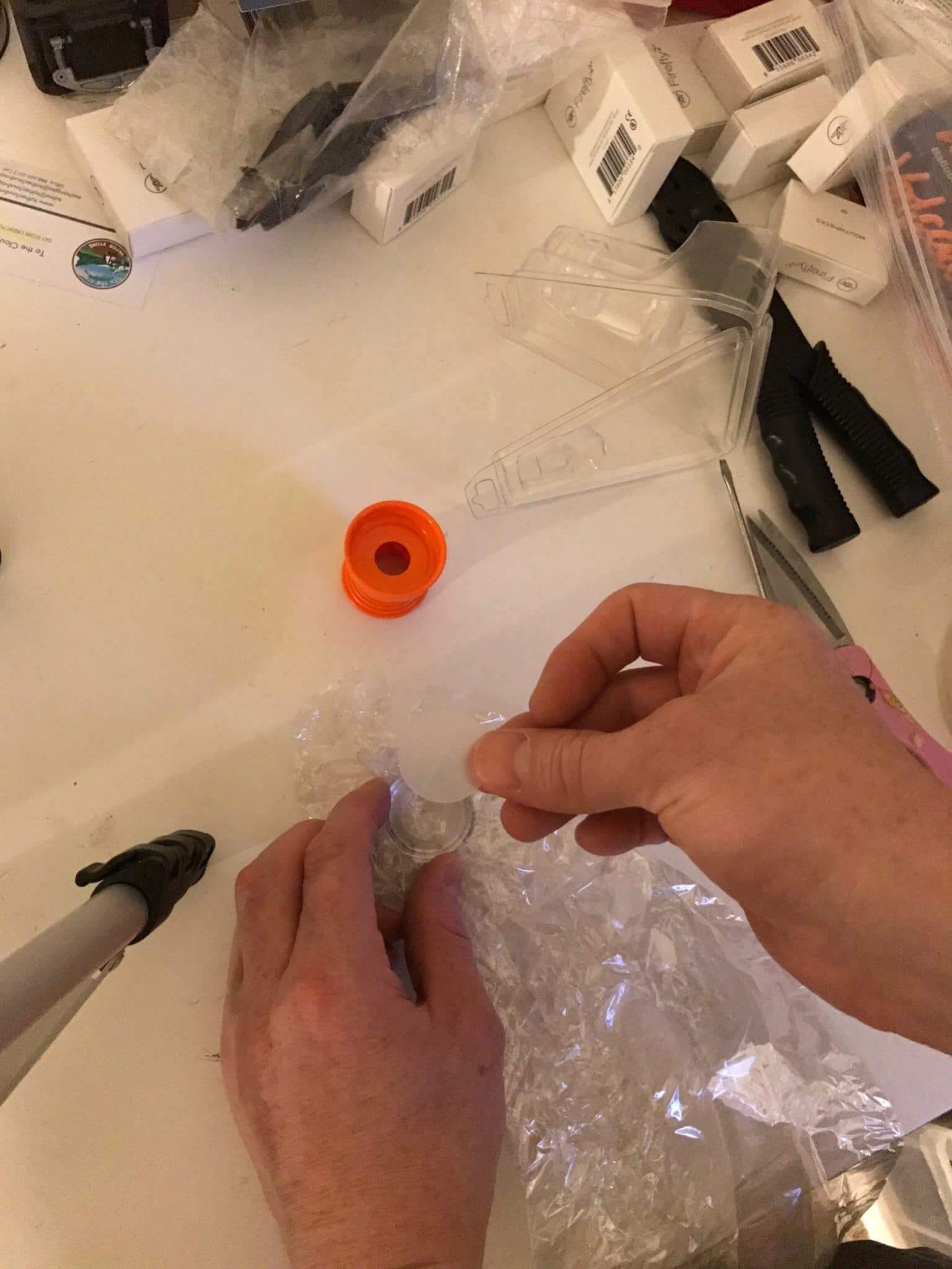 Next take your rubber air flow stopper and line it up with the plastic part on a hard surface. Make sure no excess is in the way of the plastic piece.