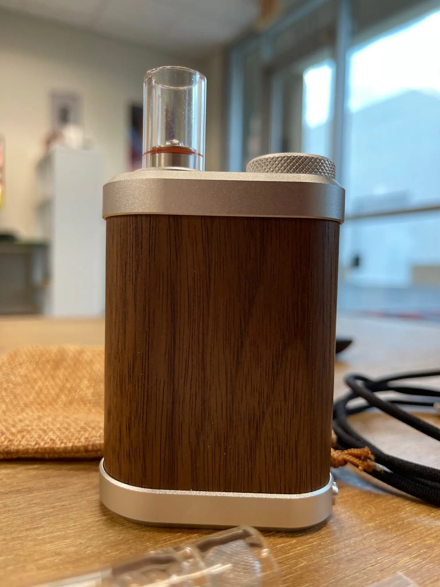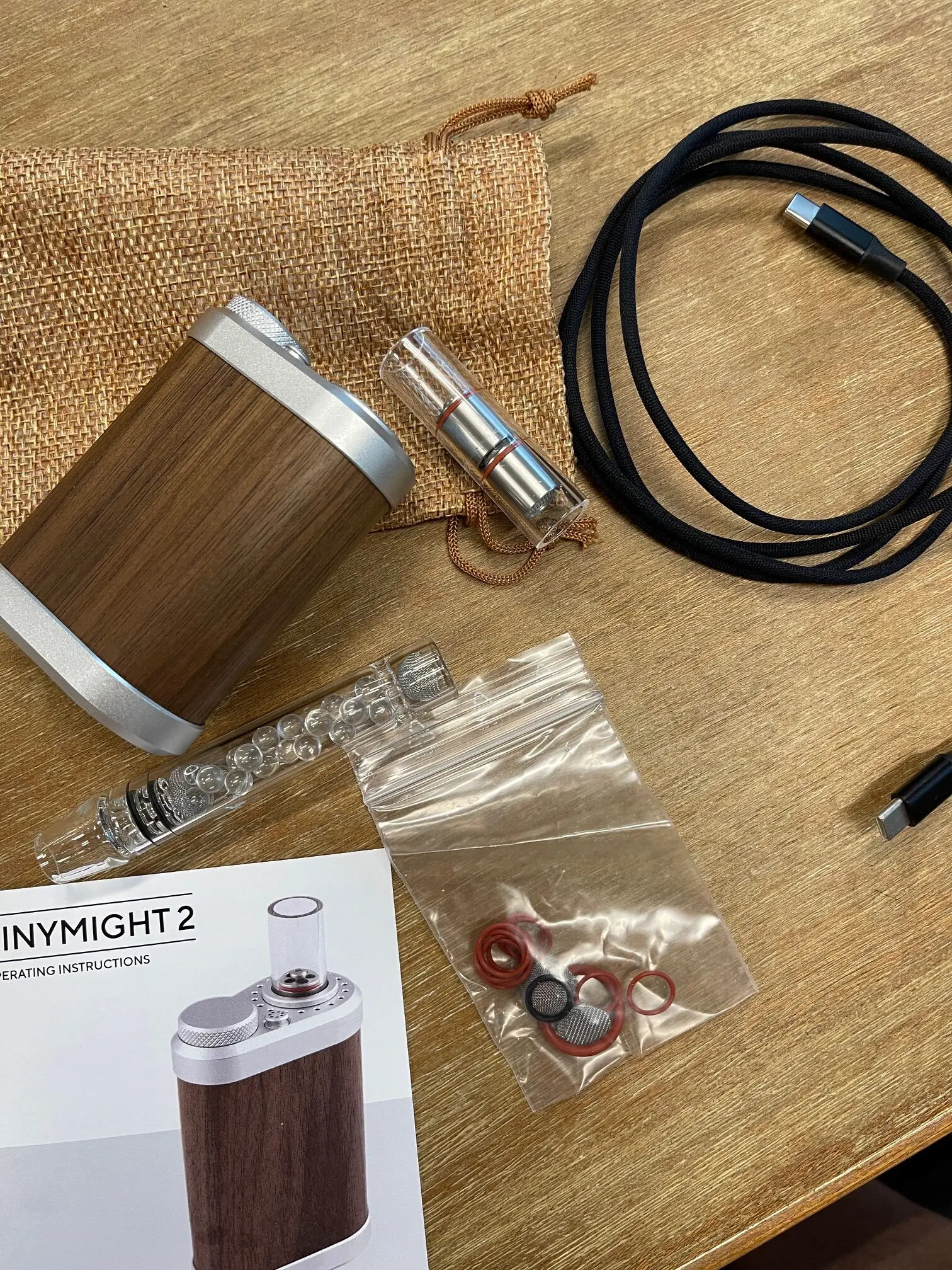 The Tinymight 2 is made from American Walnut wood and brushed metal to include stainless steel internals. The vapor path is glass and there is also a Titanium vaporpath (included in the 2023 models)Â It boasts some considerable upgrades to the electronics from the old 2019 model.