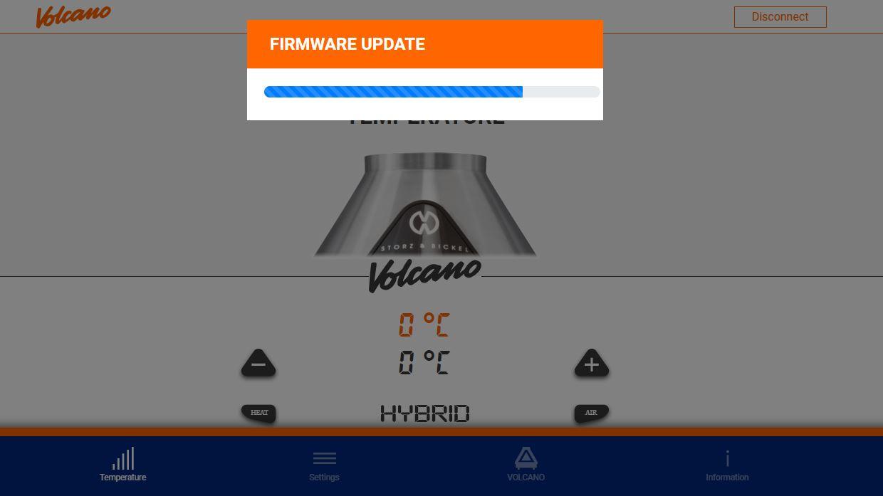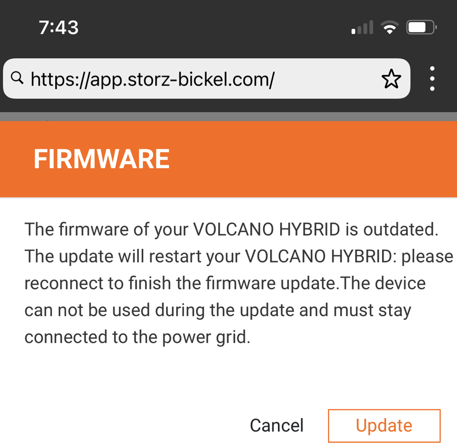 Sure enough we plugged in a Volcano Hybrid, connected to the web app and were given the message. “The firmware of your Volcano Hybrid is outdated. The update will restart your Volcano Hybrid.Â